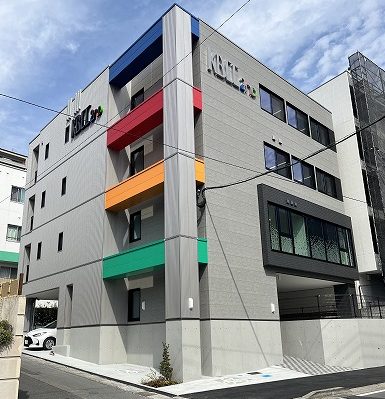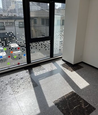 各階の外観ガラス窓には、ロゴカラーを意識した配色が施されています。