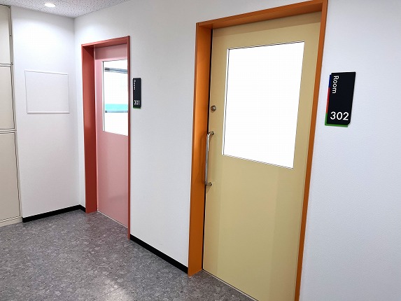 各教室の案内サインや扉、床のデザインにもロゴカラーを使用。