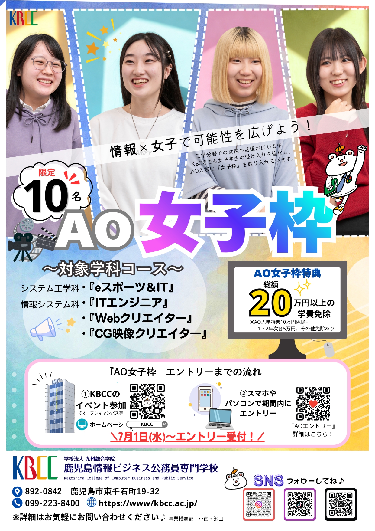 IT系やWeb系などの工学分野で女性人材の採用を積極的に行う企業が増えており、企業や業界からの要望を受けて、KBCCではAO入学「女子枠を2024年度入学生対象から設置しております。下記の学科・コースを希望する女性の方はぜひご活用ください。